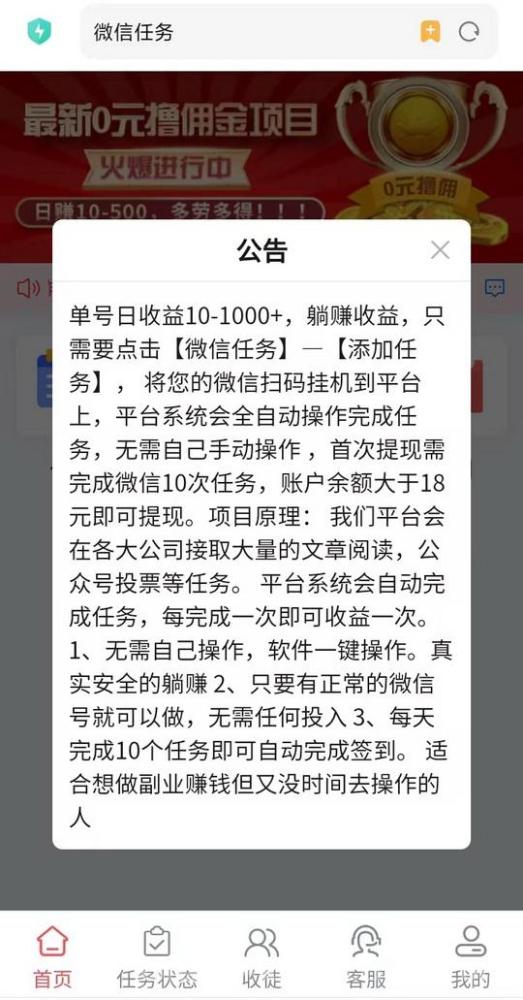 绑定v信号后,平台采用全自动挂机模式,无需任何手动操作,用户只需挂机即可轻松赚取收益。