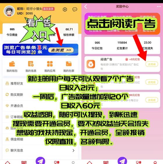 静态收益:新用户注册每天可以浏览7个广告,每条广告3元红包,连续看一个星期左右,每天可以浏览20个广告,日赚保底66元,提现秒到,所有广告红包均为第三方广告商付费支出,平台无任何泡沫。
