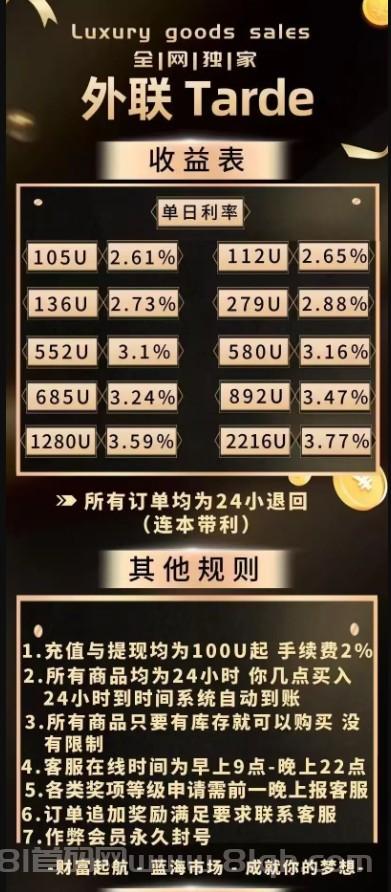 利润就是580UX3.16%~18.32U,折合人民币133左右,每单都是24小时之后本金佣金退回到你账户,之后想做继续下单就可以,不想做了就可以提现,不卡资金,所有商品只要有库存就可以拍,不限制单数,U的汇率为1:7.3左右也就是1U等于7.3人民币左右