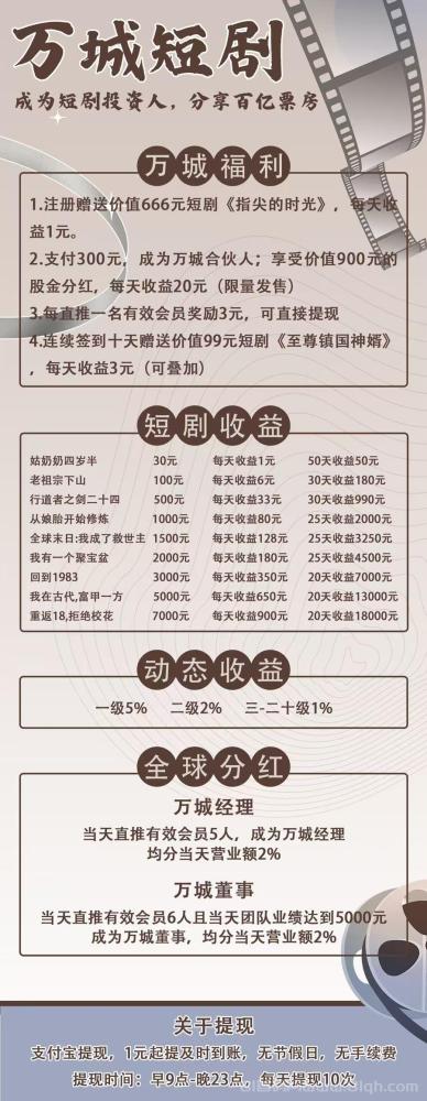 静态投资30-7000元不等,影片越多收益越多,收益2-1000元不等,提现秒到。适合长期稳定投资。