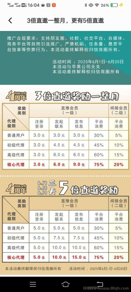 信商圈的推广收益非常可观。邀请一个人注册并登录,就能获得3元奖励;查看联系方式,奖励6元;发布资源信息,奖励9元。下级完成这些操作,你就能轻松拿到18元的收益。