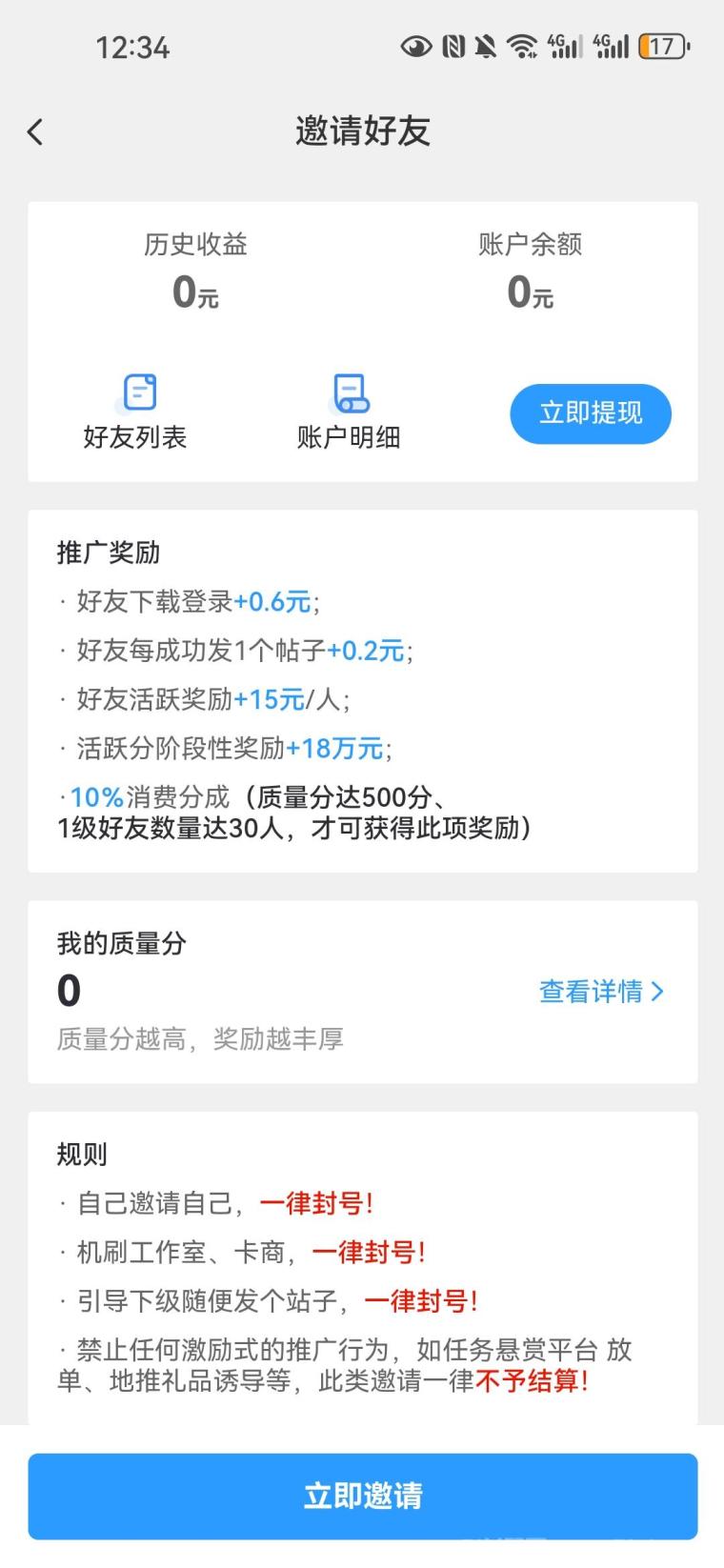 邀请好友还能狂薅奖励:好友下载登录你赚0.6元/人,好友每发1帖你拿0.2元,好友活跃直接奖15元/人,还有消费分成、阶段性大奖等你解锁!质量分越高,奖励越丰厚,