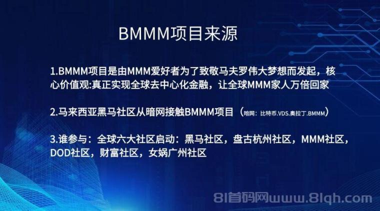 1.BMMM项目是由MMM爱好者为了致敬马夫罗伟大梦想而发起,核心价值观:真正实现全球去中心化金融,让全球MMM家人万倍回家