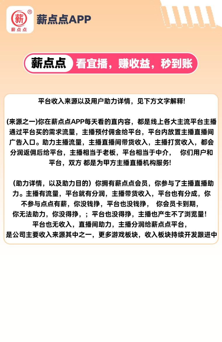 正文 薪点点赚怎么挣钱?助力3分钟挣15+85%广告分红 8248码 V评论者 /昨天 /0 评论 /468 阅读 1009 文章最后更新时间2025年10月09日,若文章内容或图片失效,请留言反馈! 全网首发《薪点点》,每天看看直播助力即可,看直播简单助力,每天妥妥收益15元兜底,提现秒速到,赶紧上车致富。薪点点攻略:1:白银会员每天看播得5金币=5元2:黄金会员每天看播的15金币=15元3:成为区域合作商,可享受平台85%广告分成推广收益简介:1.直推20%佣金➕20%每天助力分润2.间推10%佣金➕10%每天助力分润3.上星级芜限级团队收益1星3%➕2星7%=10%提米说明:满15元起提到支付宝,多劳多赚,火速开干! 版权声明:本文内容由互联网用户自发贡献,该文观点仅代表作者本人。本站仅提供信息存储空间服务,不拥有所有权,不承担相关法律责任。请勿盲目下载注册。如发现本站有涉嫌抄袭侵权/违法违规的内容, 请发送邮件至:1442121520@qq.com