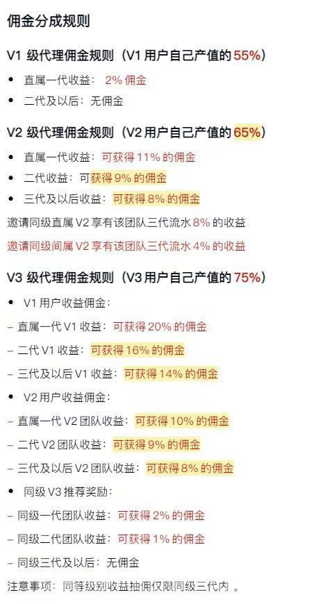 v3等级拿最高三代佣金,一代20%佣金,二代16%佣金,三代14%佣金。